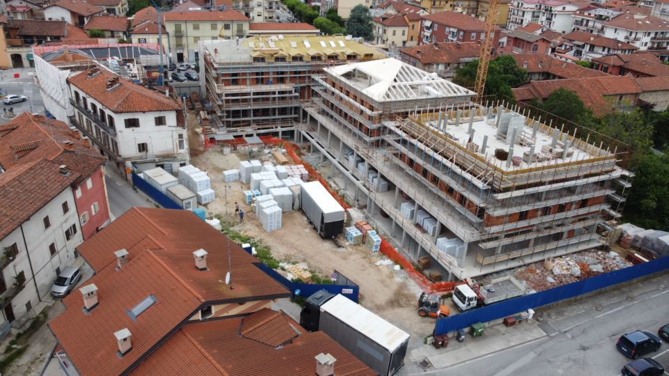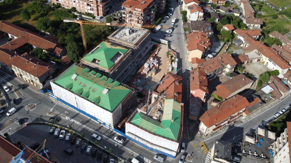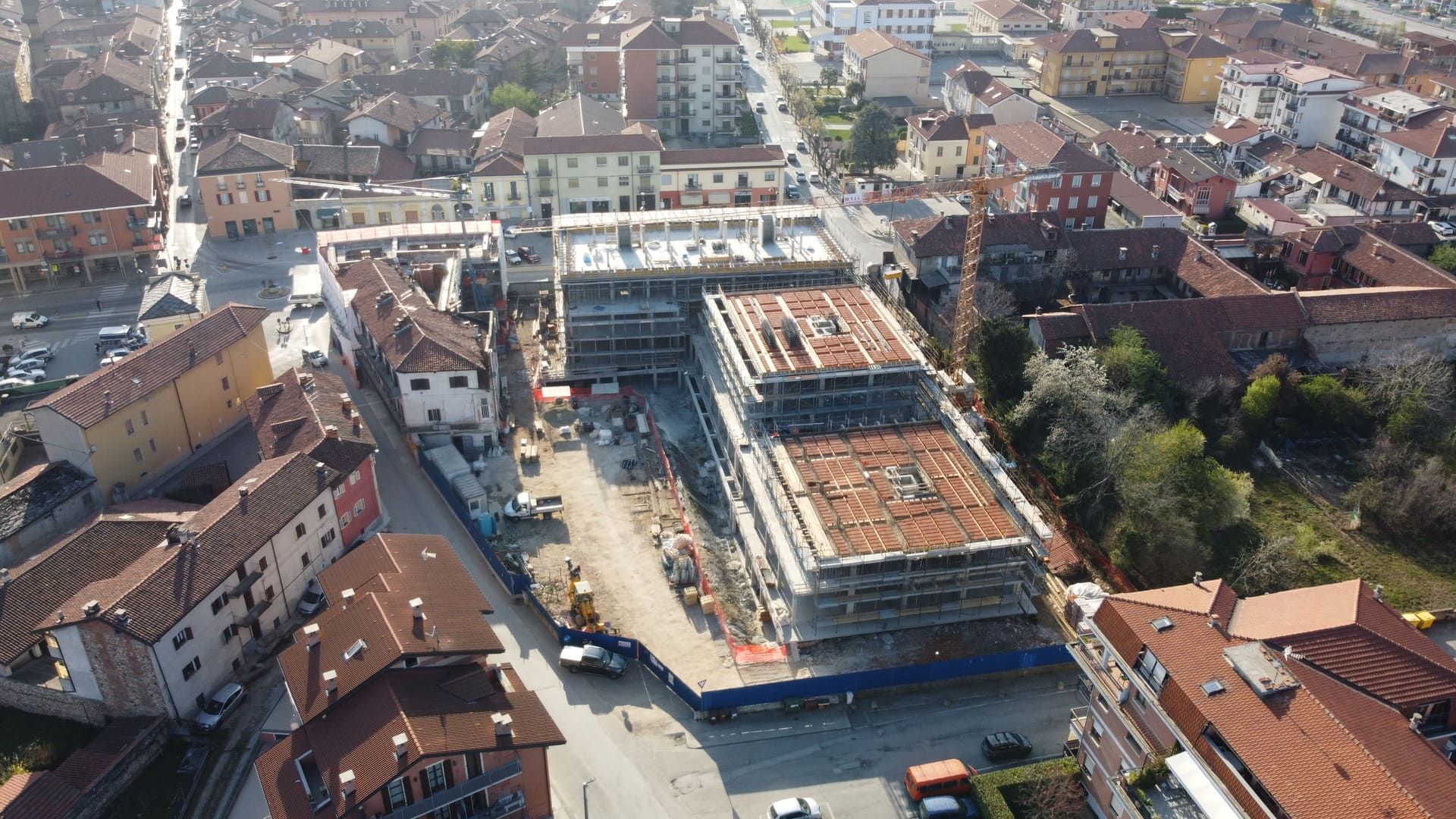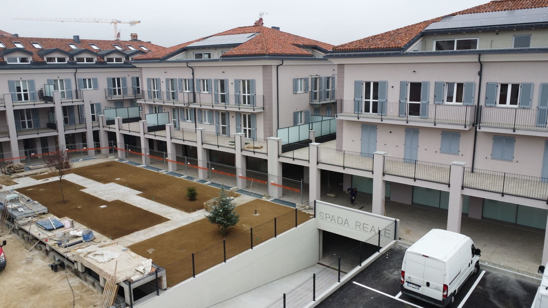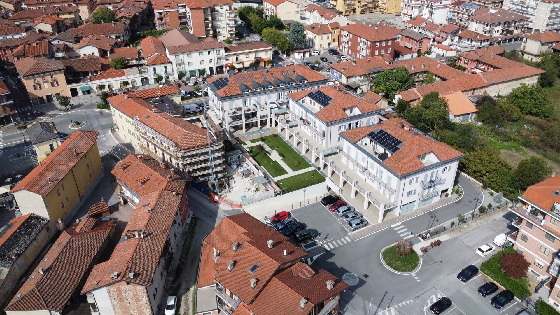 Gli edifici si sviluppano su più livelli, ciascuno dotato di ascensore, e racchiudono un ampio cortile interno con aree verdi e percorsi pedonali, pensati come spazi comuni che favoriscono vivibilità e socialità. Le facciate presentano linee sobrie e contemporanee, con balconi e terrazzi che ampliano la qualità degli ambienti interni e tetti a falde in coppi che richiamano la tradizione locale.