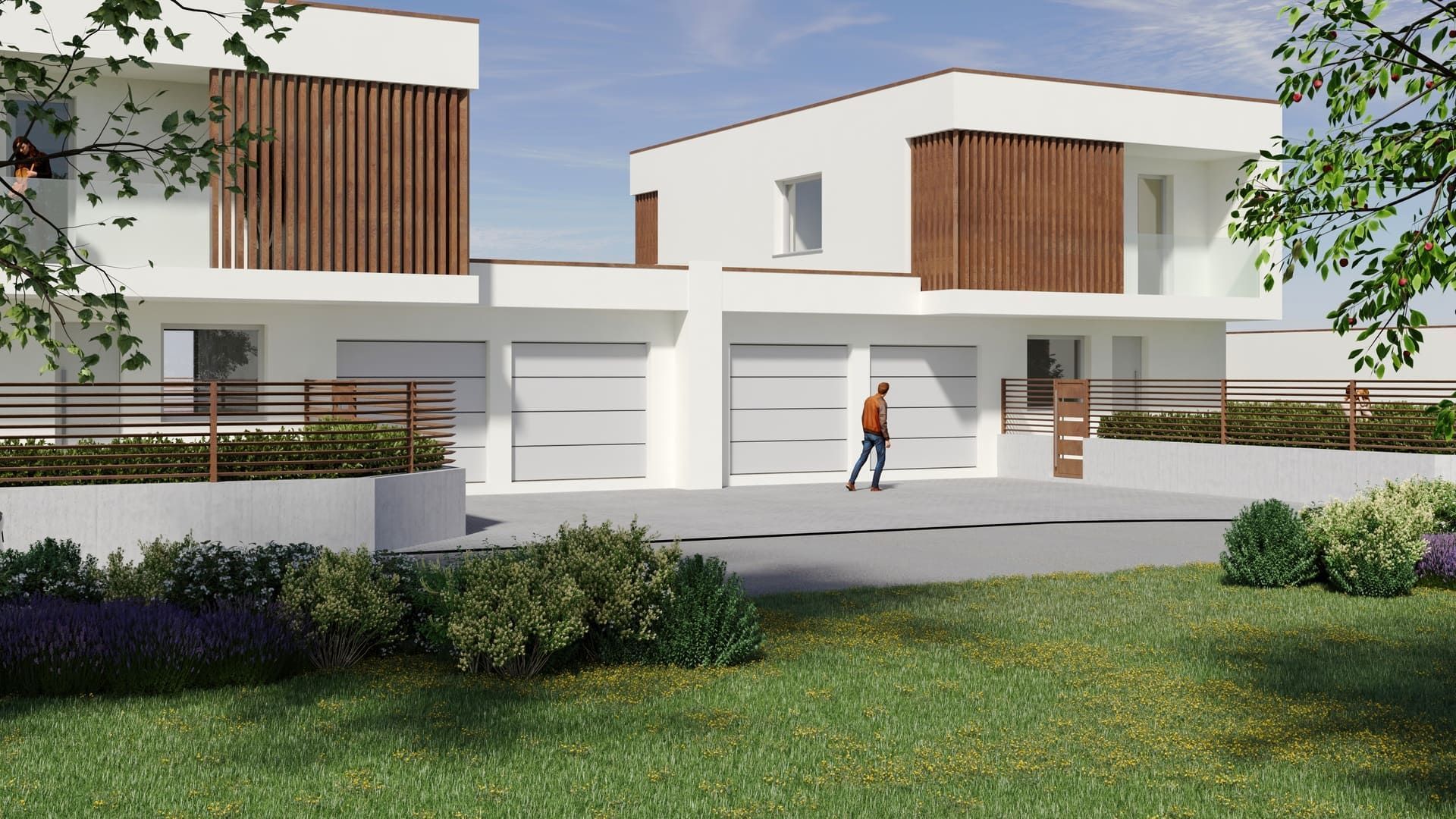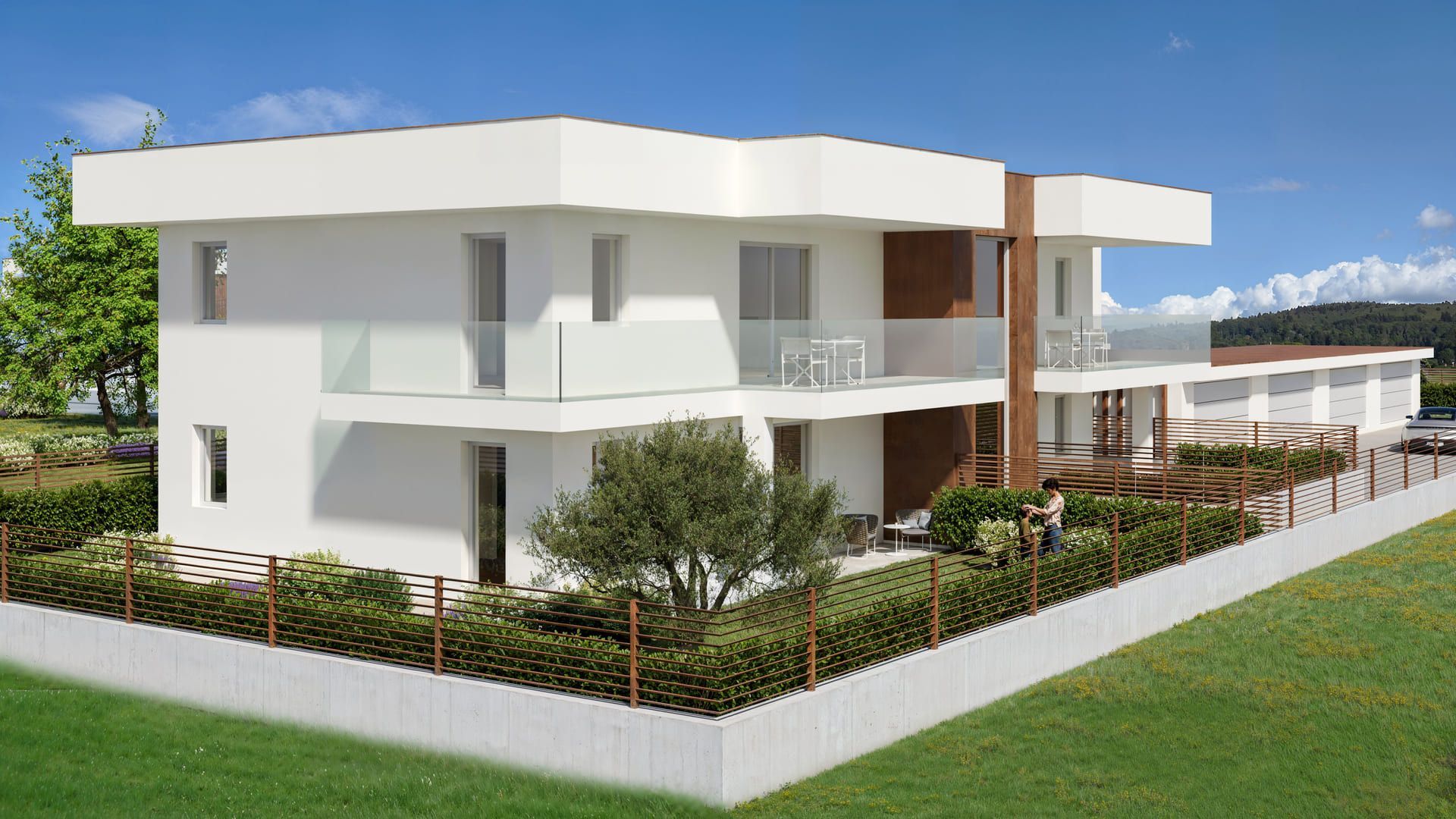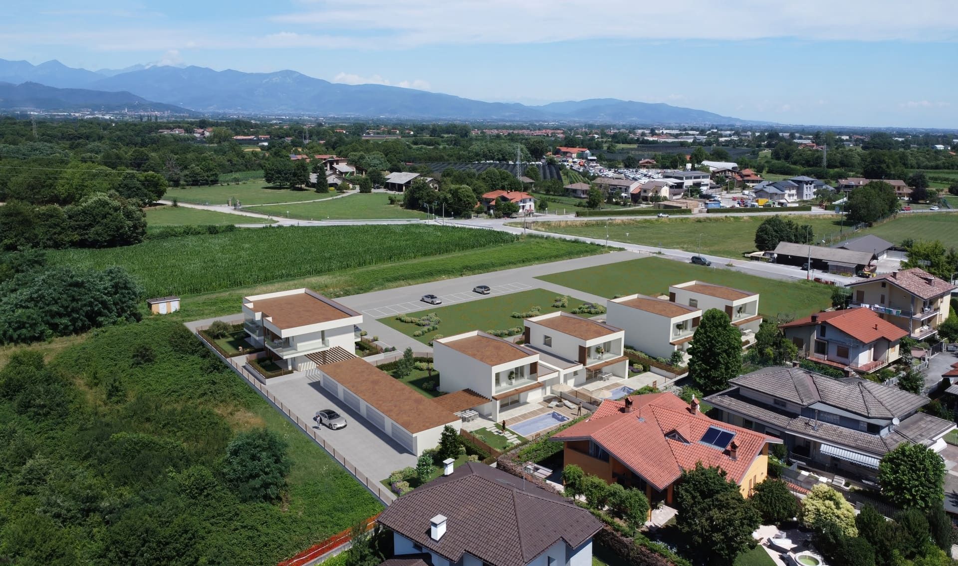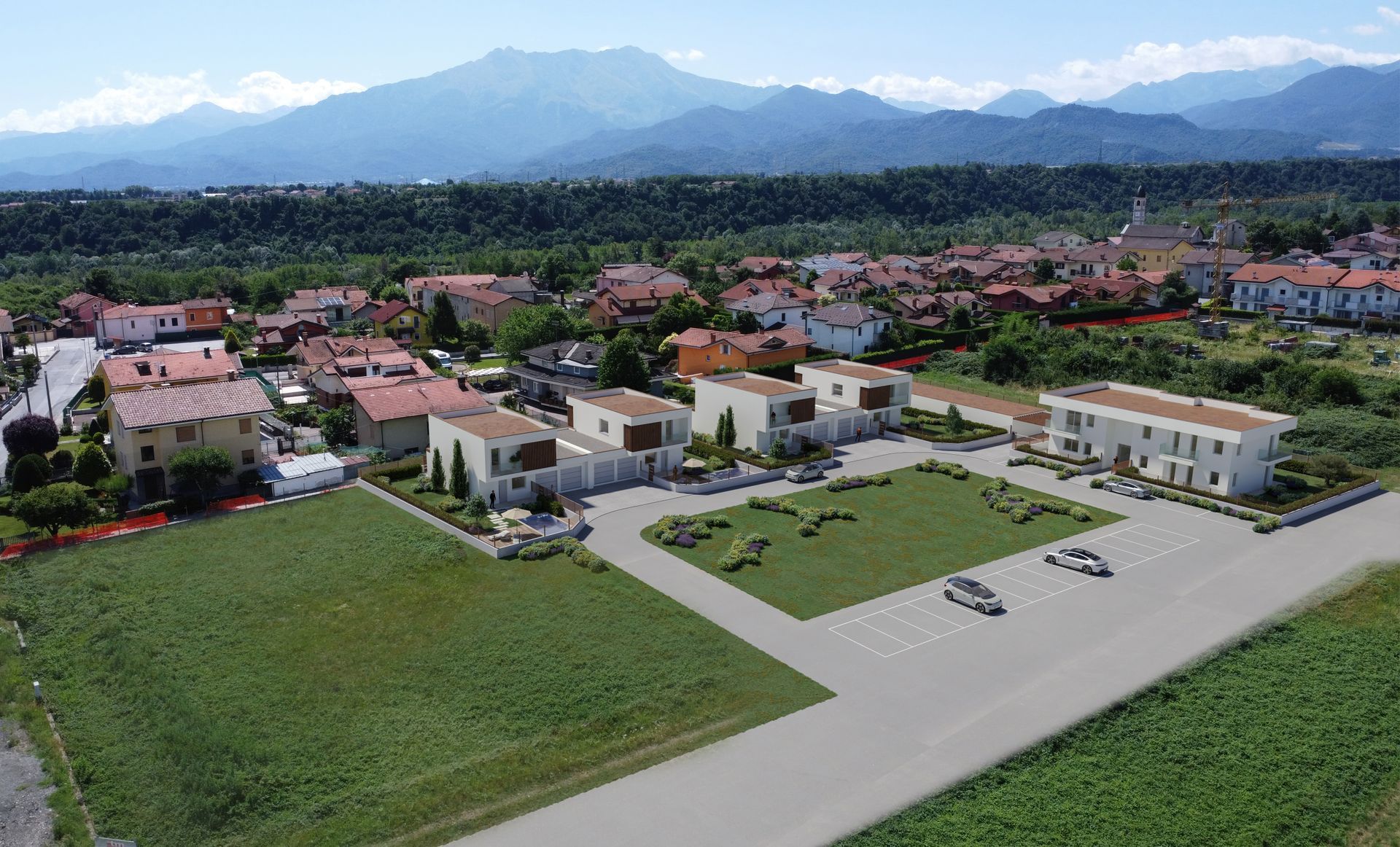 Accanto alle villette si sviluppa un quinto blocco che ospita quattro appartamenti, ciascuno progettato per offrire ambienti luminosi, terrazzi vivibili e una distribuzione funzionale degli spazi. Anche in questo caso, ogni unità è completata da un box auto adiacente.