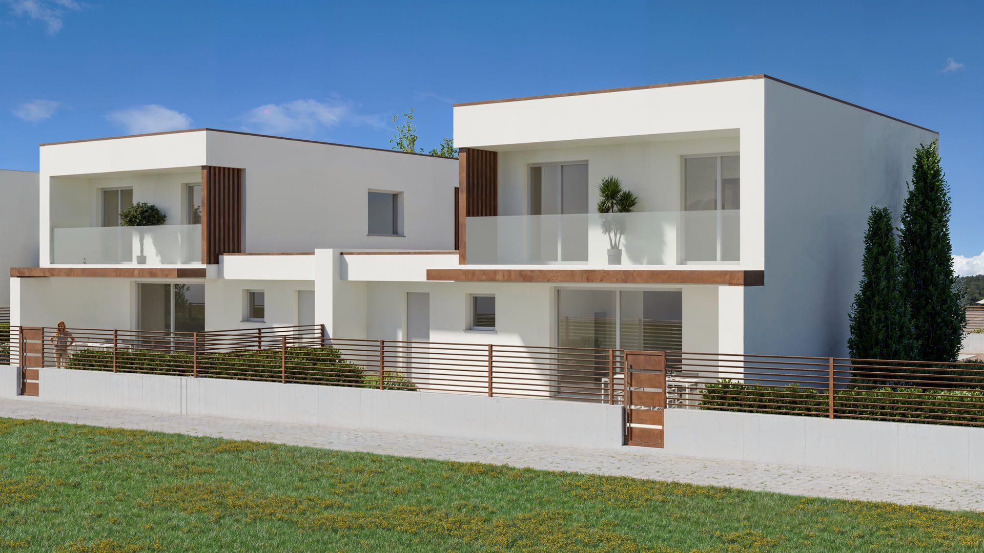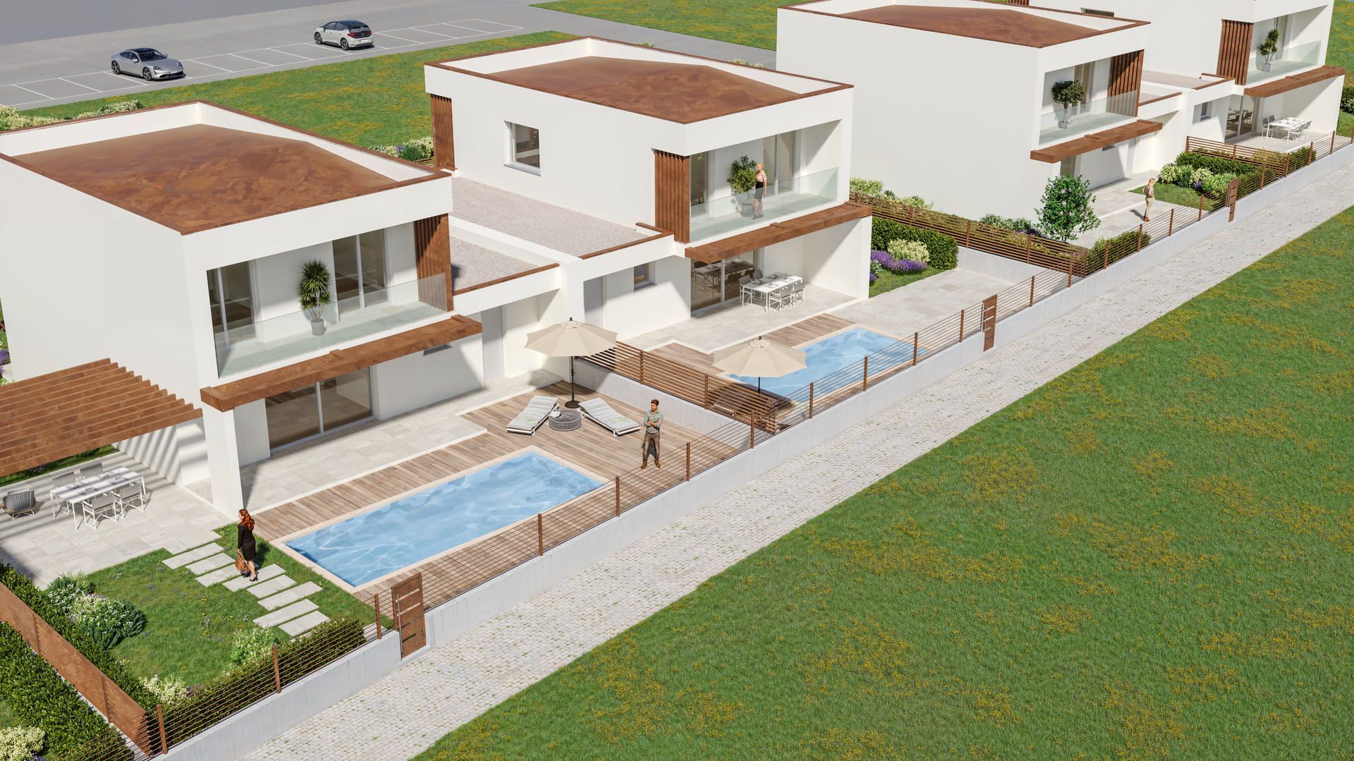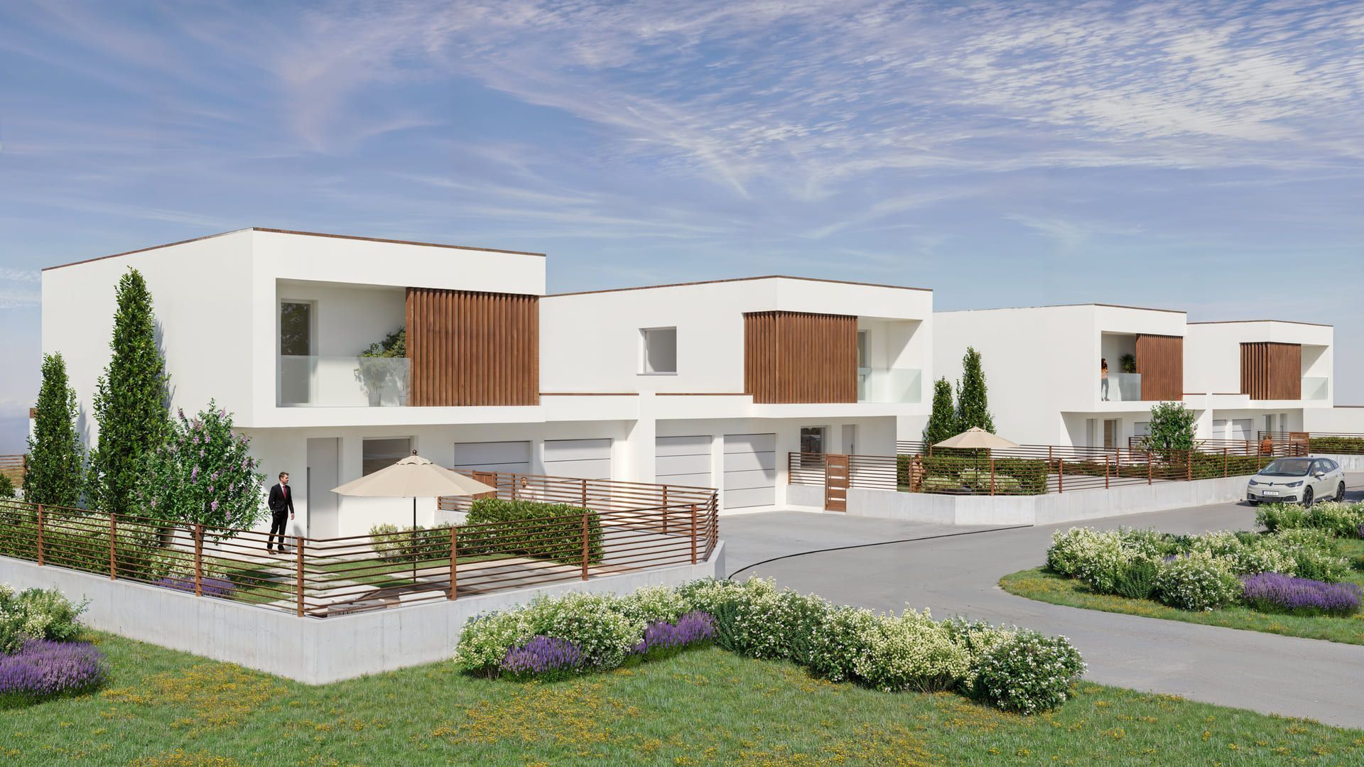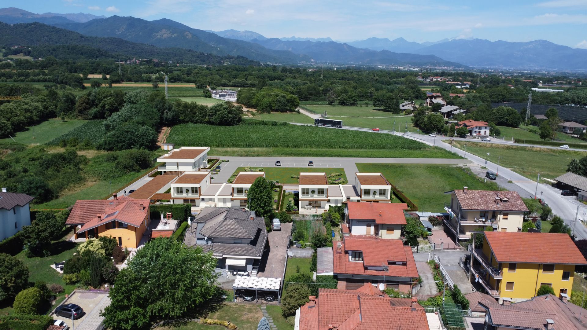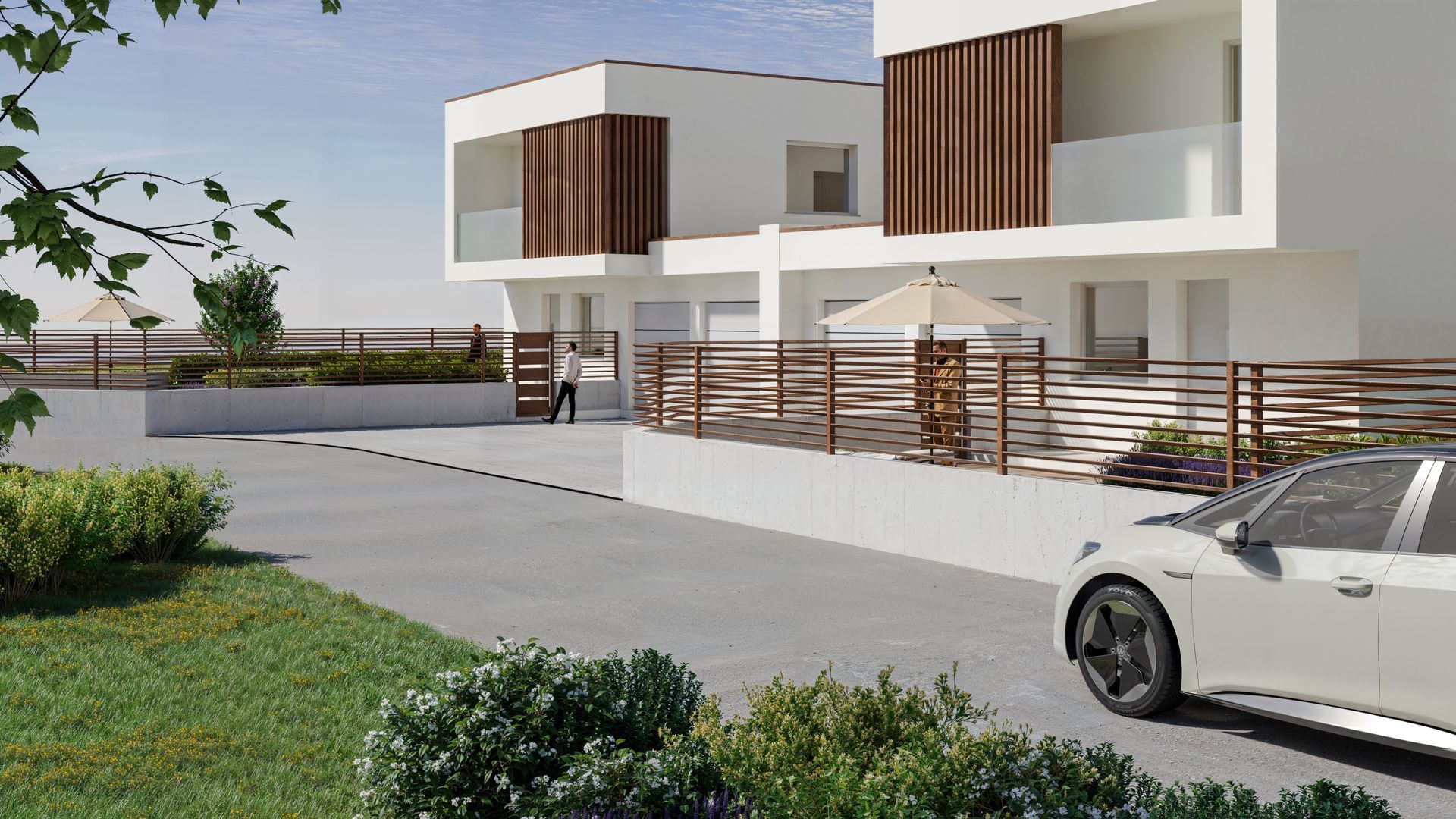 Accanto alle villette si sviluppa un quinto blocco che ospita quattro appartamenti, ciascuno progettato per offrire ambienti luminosi, terrazzi vivibili e una distribuzione funzionale degli spazi. Anche in questo caso, ogni unità è completata da un box auto adiacente.